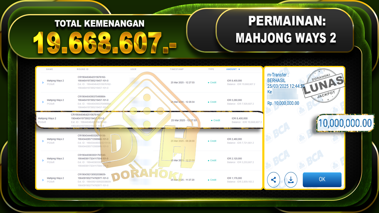 Bukti JP MAHJONG WAYS 2 – ucapkan selamat kepada user id Faixxx atas kemenangan di MAHJONG WAYS 2 dengan total kemenangan Rp.19.668.607,- . Yang pasti nya langsung LUNAS sesuai bukti ya bosku. Dorahoki nih bosku berapapun akan tetap kami bayar lunas ya bosku.