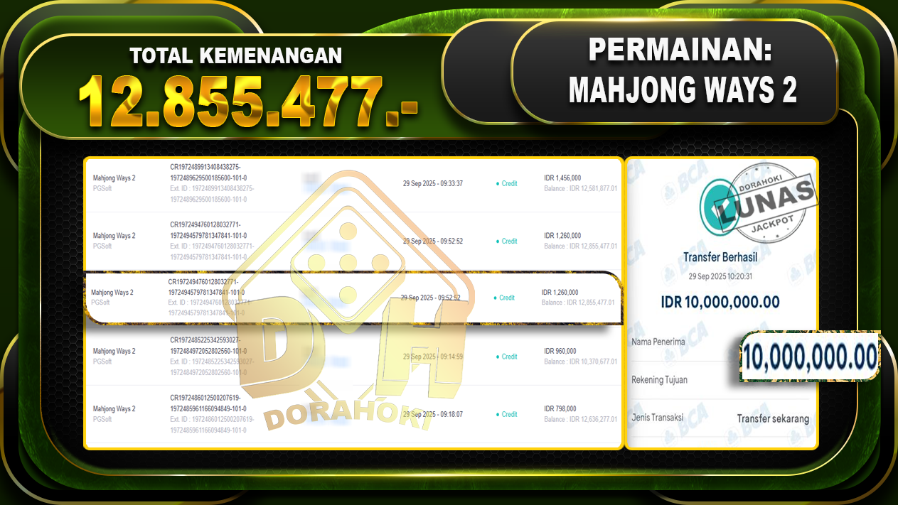Bukti JP Mahjong Ways 2 – ucapkan selamat kepada user id kurxxxx atas kemenangan di Mahjong Ways 2 dengan total kemenangan Rp.12.855.477,- Yang pasti nya langsung LUNAS sesuai bukti ya bosku. Dorahoki nih bosku berapapun akan tetap kami bayar lunas ya bosku
