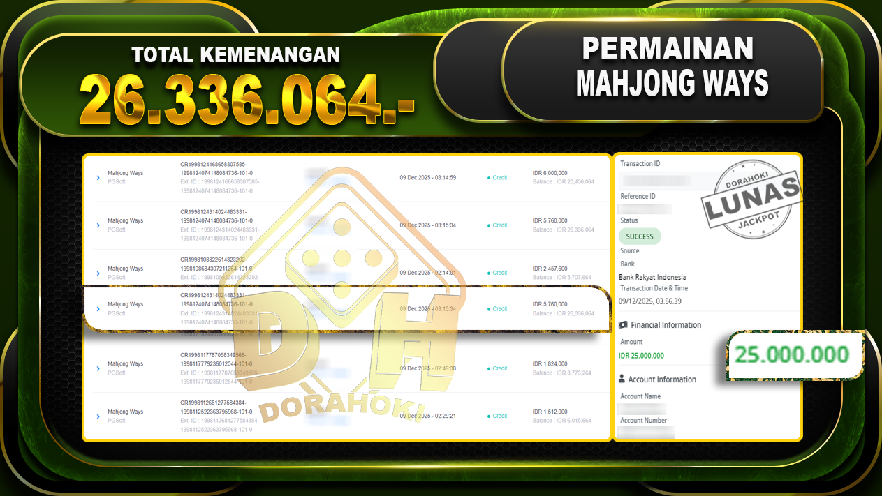 Bukti JP Mahjong Ways – ucapkan selamat kepada user id pepxxxx atas kemenangan di Mahjong Ways dengan total kemenangan Rp.26.336.064,- Yang pasti nya langsung LUNAS sesuai bukti ya bosku. Dorahoki nih bosku berapapun akan tetap kami bayar lunas ya bosku
