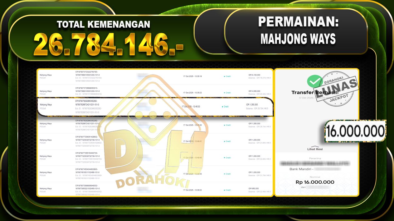 Bukti JP Mahjong Ways – ucapkan selamat kepada user id bagxxxxxxx atas kemenangan di Mahjong Ways dengan total kemenangan Rp.26.784.176,- Yang pasti nya langsung LUNAS sesuai bukti ya bosku. Dorahoki nih bosku berapapun akan tetap kami bayar lunas ya bosku