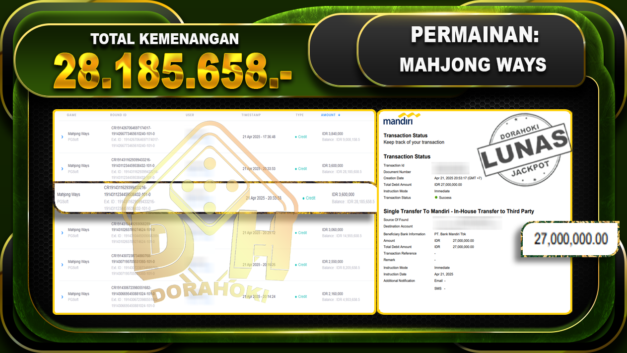 Bukti JP MAHJONG WAYS – ucapkan selamat kepada user id Bagxxx atas kemenangan di MAHJONG WAYS dengan total kemenangan Rp.28.185.658,- . Yang pasti nya langsung LUNAS sesuai bukti ya bosku. Dorahoki nih bosku berapapun akan tetap kami bayar lunas ya bosku.