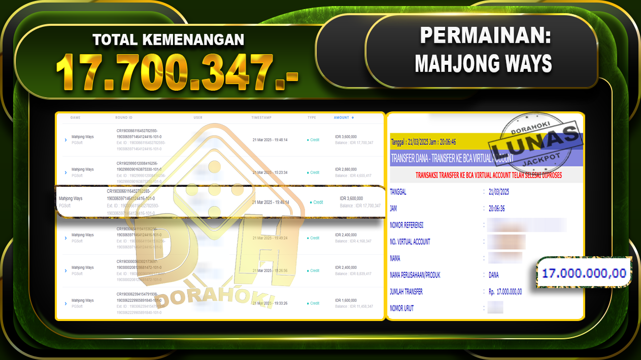 Bukti JP MAHJONG WAYS – ucapkan selamat kepada user id Karxxx atas kemenangan di MAHJONG WAYS dengan total kemenangan Rp.17.700.347,- . Yang pasti nya langsung LUNAS sesuai bukti ya bosku. Dorahoki nih bosku berapapun akan tetap kami bayar lunas ya bosku.