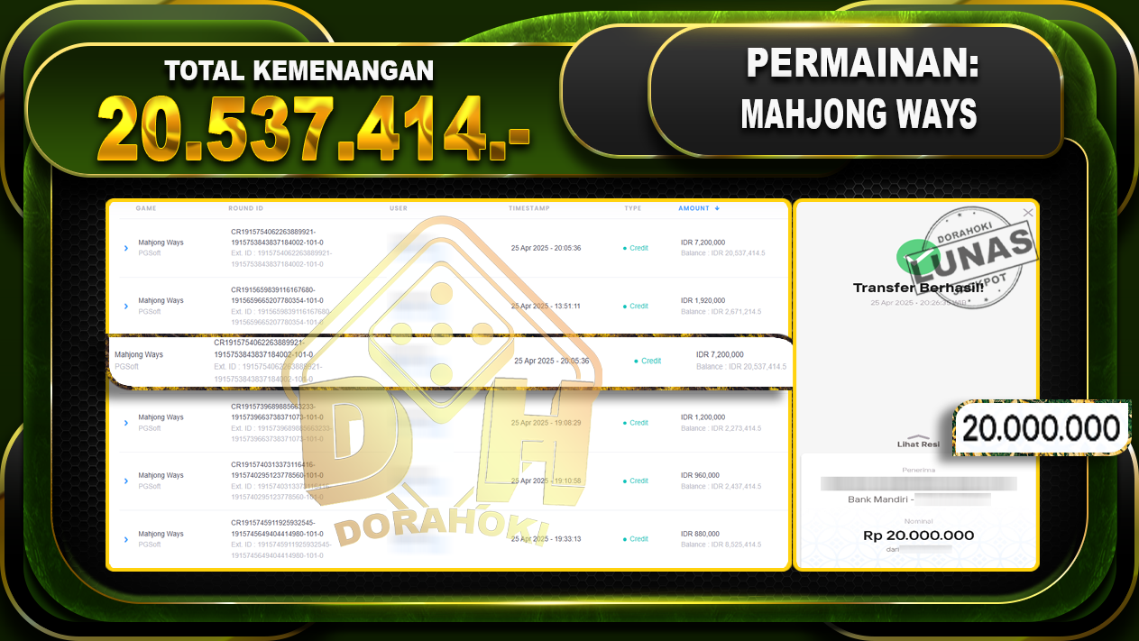 Bukti JP MAHJONG WAYS – ucapkan selamat kepada user id Bagxxx atas kemenangan di MAHJONG WAYS dengan total kemenangan Rp.20.537.414,- . Yang pasti nya langsung LUNAS sesuai bukti ya bosku. Dorahoki nih bosku berapapun akan tetap kami bayar lunas ya bosku.
