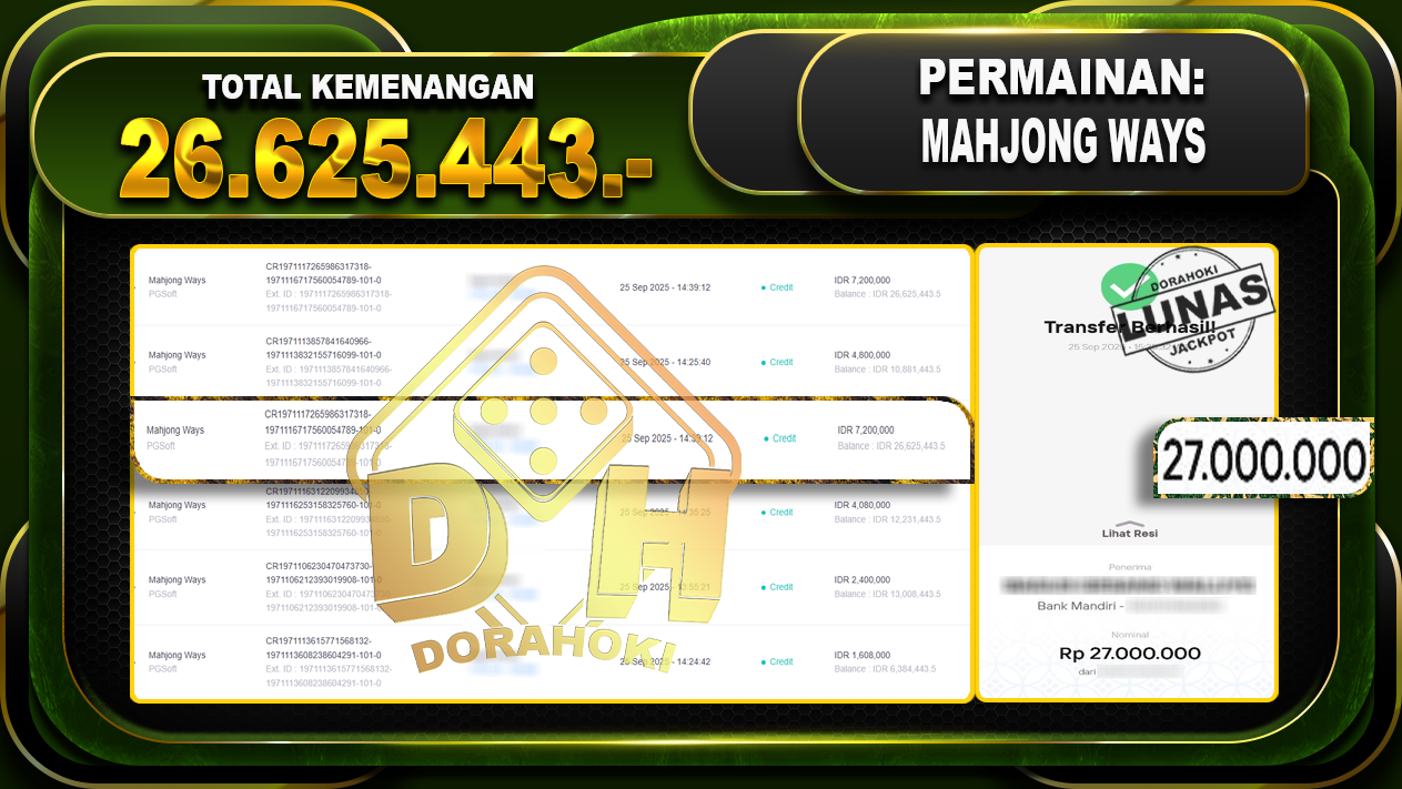 Bukti JP Mahjong Ways – ucapkan selamat kepada user id baguxxxxx atas kemenangan di Mahjong Ways dengan total kemenangan Rp.26.625.443,- Yang pasti nya langsung LUNAS sesuai bukti ya bosku. Dorahoki nih bosku berapapun akan tetap kami bayar lunas ya bosku