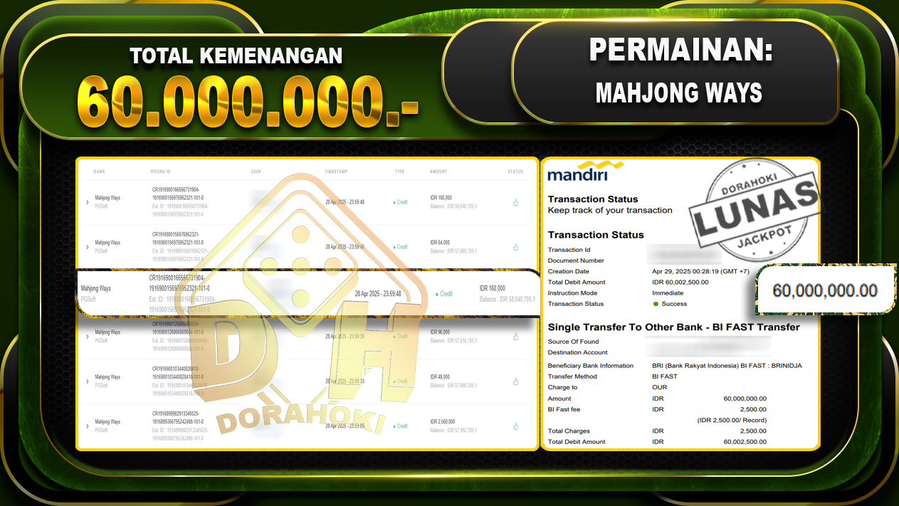 Bukti JP MAHJONG WAYS – ucapkan selamat kepada user id Praxxx atas kemenangan di MAHJONG WAYS dengan total kemenangan Rp.60.000.000,- . Yang pasti nya langsung LUNAS sesuai bukti ya bosku. Dorahoki nih bosku berapapun akan tetap kami bayar lunas ya bosku.