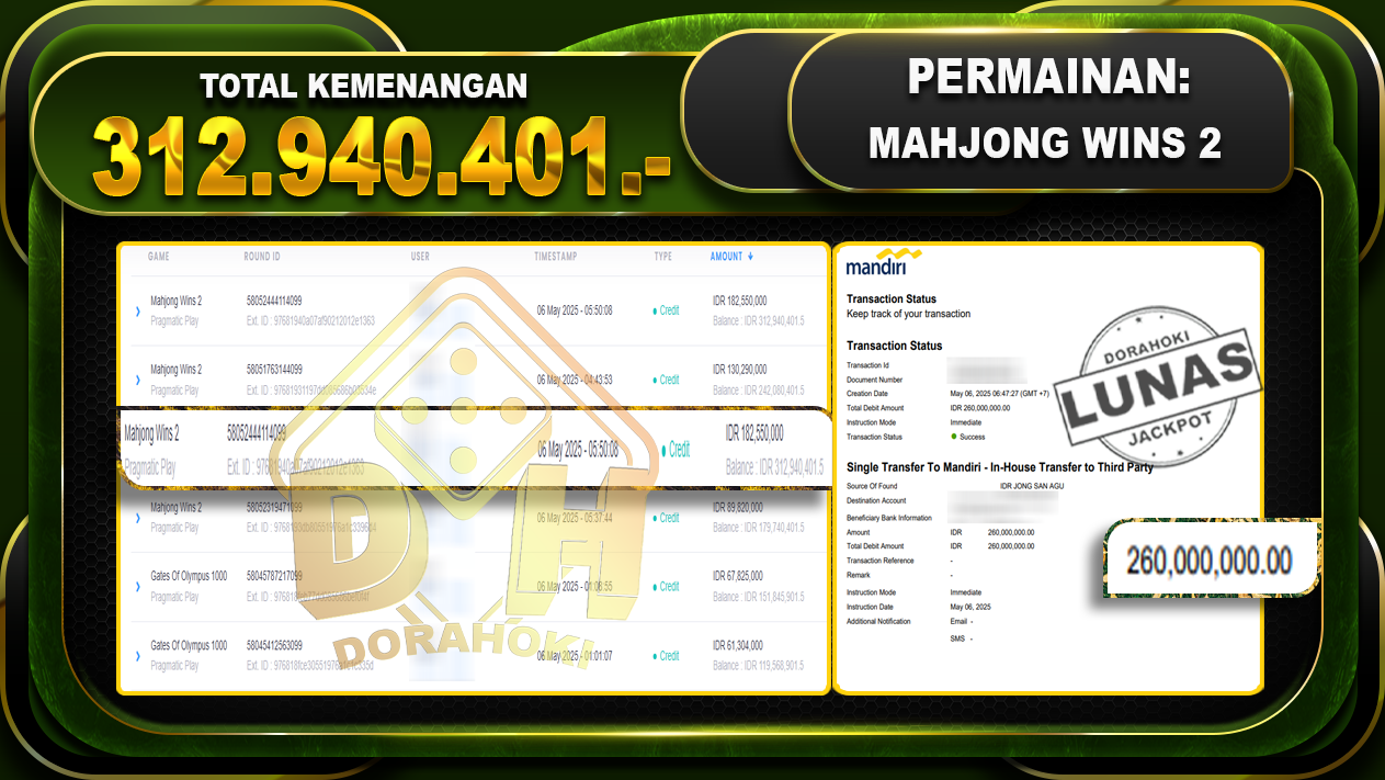 Bukti JP MAHJONG WINS 2 – ucapkan selamat kepada user id Dogxxx atas kemenangan di MAHJONG WINS 2 dengan total kemenangan Rp.312.940.401,- . Yang pasti nya langsung LUNAS sesuai bukti ya bosku. Dorahoki nih bosku berapapun akan tetap kami bayar lunas ya bosku.