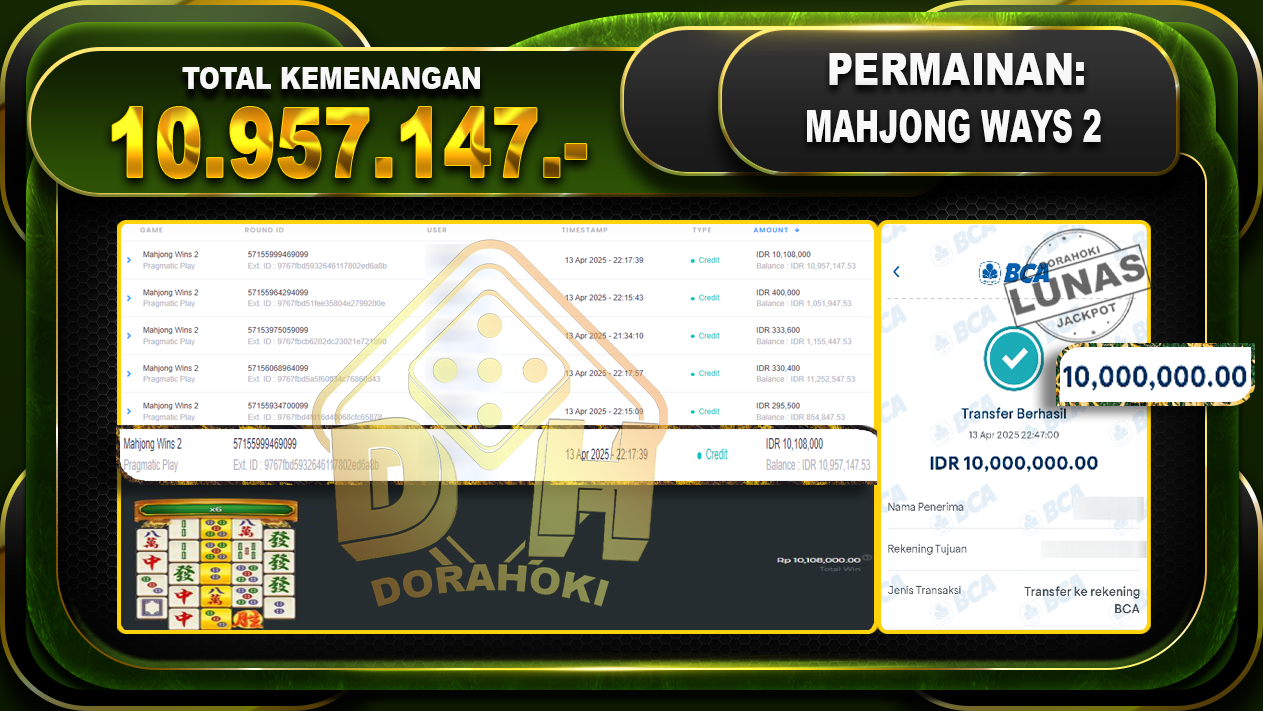 Bukti JP  MAHJONG WINS 2 – ucapkan selamat kepada user id Syexxx atas kemenangan di MAHJONG WINS 2  dengan total kemenangan Rp.10.957.147,- . Yang pasti nya langsung LUNAS sesuai bukti ya bosku. Dorahoki nih bosku berapapun akan tetap kami bayar lunas ya bosku.