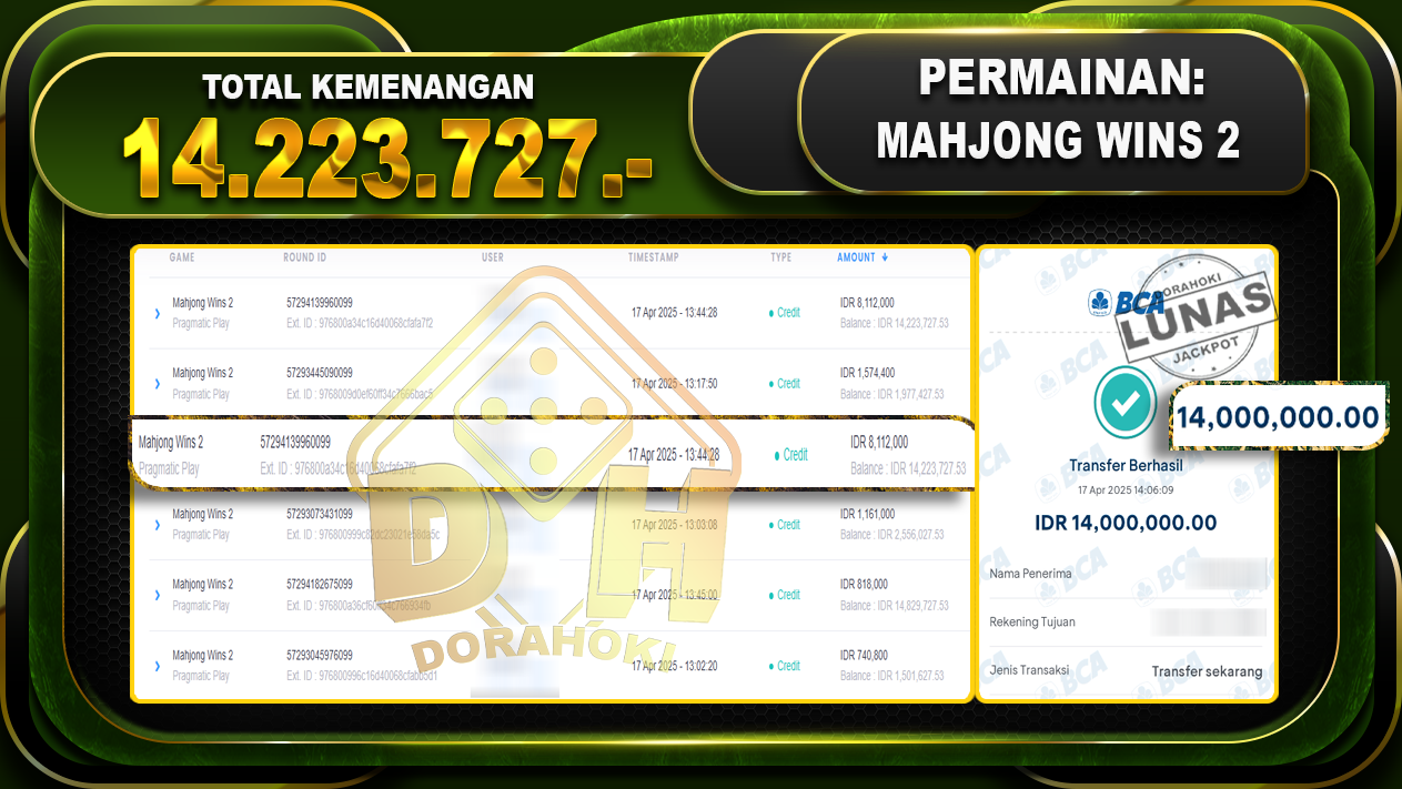 Bukti JP MAHJONG WINS 2 – ucapkan selamat kepada user id Syexxx atas kemenangan di MAHJONG WINS 2 dengan total kemenangan Rp.14.223.727,- . Yang pasti nya langsung LUNAS sesuai bukti ya bosku. Dorahoki nih bosku berapapun akan tetap kami bayar lunas ya bosku.