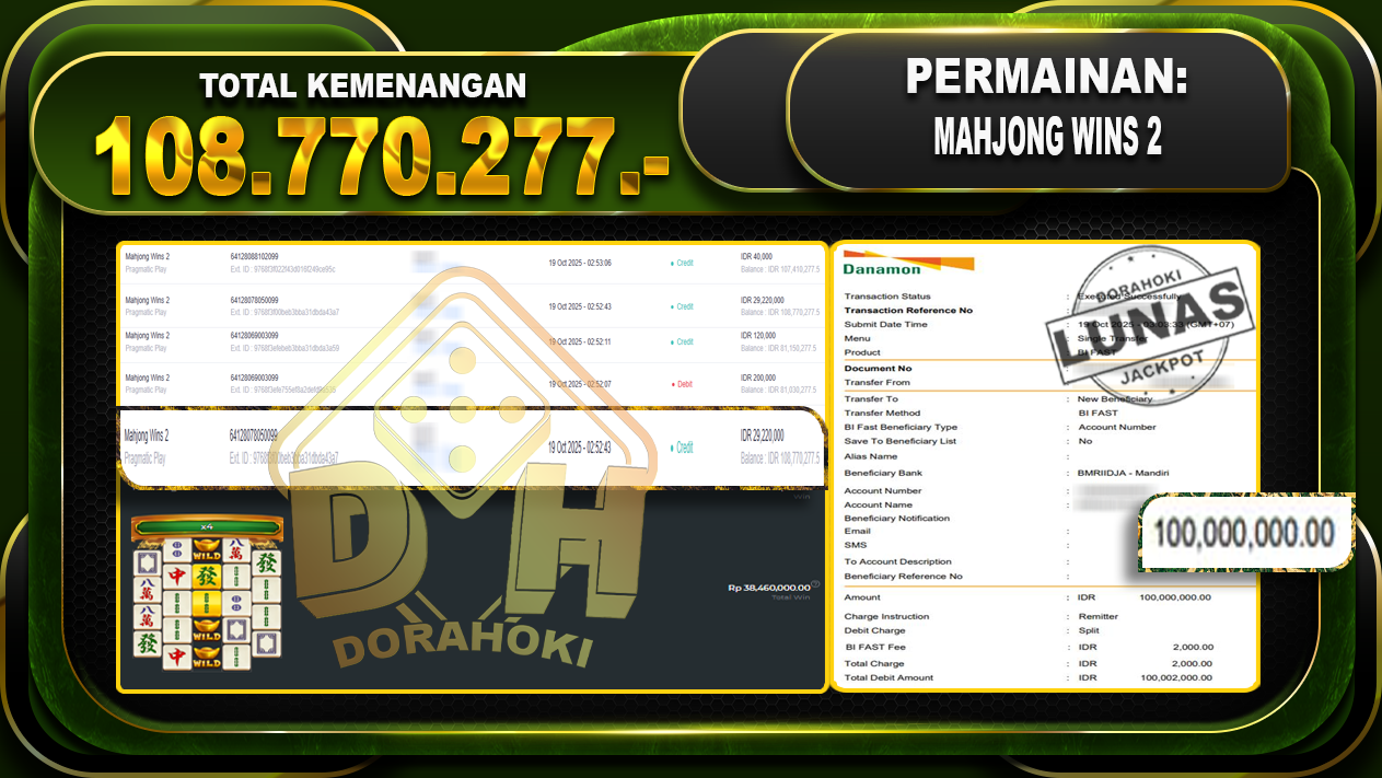 Bukti JP Mahjong Wins 2 – ucapkan selamat kepada user id dogxxxx atas kemenangan di  Mahjong Wins 2 dengan total kemenangan Rp.108.770.277,- Yang pasti nya langsung LUNAS sesuai bukti ya bosku. Dorahoki nih bosku berapapun akan tetap kami bayar lunas ya bosku.