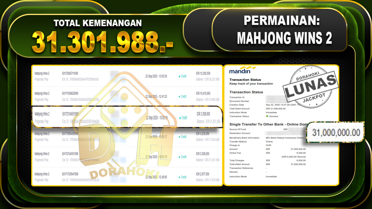 Bukti JP Mahjong Wins 2 – ucapkan selamat kepada user id Fmfxxxxx atas kemenangan di Mahjong Wins 2 dengan total kemenangan Rp.31.307.988,- Yang pasti nya langsung LUNAS sesuai bukti ya bosku. Dorahoki nih bosku berapapun akan tetap kami bayar lunas ya bosku.