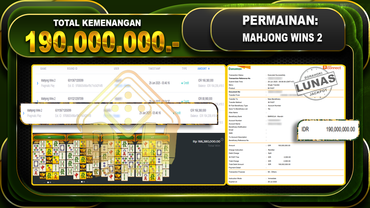 Bukti JP MAHJONG WINS 2 – ucapkan selamat kepada user id DOGxxx atas kemenangan di MAHJONG WINS 2 dengan total kemenangan Rp.190.000.000,- . Yang pasti nya langsung LUNAS sesuai bukti ya bosku. Dorahoki nih bosku berapapun akan tetap kami bayar lunas ya bosku.