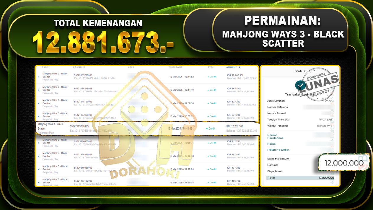 Bukti JP MAHJONG WINS 3 BLACK SCATTER- ucapkan selamat kepada user id Semxxx atas kemenangan di MAHJONG WINS 3 BLACK SCATTER dengan total kemenangan Rp.12.881.673,- . Yang pasti nya langsung LUNAS sesuai bukti ya bosku. Dorahoki nih bosku berapapun akan tetap kami bayar lunas ya bosku.
