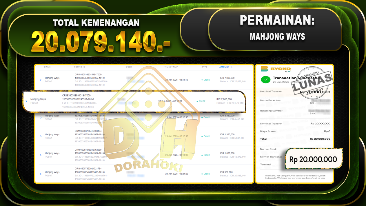 Bukti JP MAHJONG WINS – ucapkan selamat kepada user id KUMxxx atas kemenangan di MAHJONG WINS dengan total kemenangan Rp.20.079.140,- . Yang pasti nya langsung LUNAS sesuai bukti ya bosku. Dorahoki nih bosku berapapun akan tetap kami bayar lunas ya bosku.