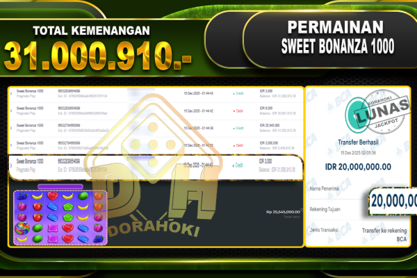 Bukti JP Sweet Bonanza 1000 – ucapkan selamat kepada user id bawxx atas kemenangan di  Sweet Bonanza 1000 dengan total kemenangan Rp.31.000.910,- Yang pasti nya langsung LUNAS sesuai bukti ya bosku. Dorahoki nih bosku berapapun akan tetap kami bayar lunas ya bosku.