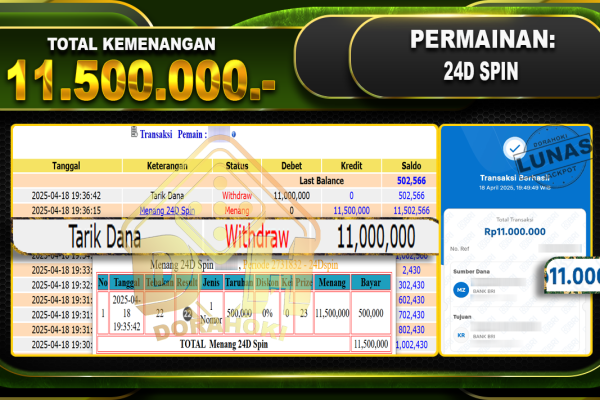 Bukti JP 24D SPIN- ucapkan selamat kepada user id Khaxxx atas kemenangan di 24D SPIN dengan total kemenangan Rp.11.500.000,- . Yang pasti nya langsung LUNAS sesuai bukti ya bosku. Dorahoki nih bosku berapapun akan tetap kami bayar lunas ya bosku. Kami mengucapkan Terima Kasih telah mempercayakan DORAHOKI sebagai Bandar Online pilihan dalam bermain judi online. Semoga…
