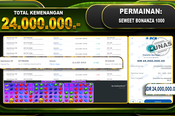 Bukti JP Sweet Bonanza 1000 – ucapkan selamat kepada user id BADxxx atas kemenangan di Sweet Bonanza 1000 dengan total kemenangan Rp.24.000.000,- . Yang pasti nya langsung LUNAS sesuai bukti ya bosku. Dorahoki nih bosku berapapun akan tetap kami bayar lunas ya bosku.