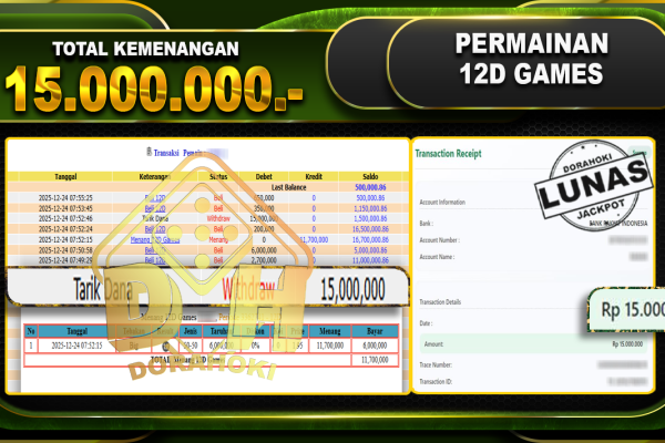 Bukti JP 12D Games – ucapkan selamat kepada user id R3nxxxx atas kemenangan di  12D Games  dengan total kemenangan Rp.15.000.000,- Yang pasti nya langsung LUNAS sesuai bukti ya bosku. Dorahoki nih bosku berapapun akan tetap kami bayar lunas ya bosku.