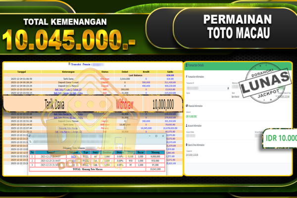 Bukti JP TOGEL TOTO MACAU 4D – ucapkan selamat kepada user id amaxxxxx atas kemenangan di  TOGEL TOTO MACAU 4D dengan total kemenangan Rp.10.045.000,- Yang pasti nya langsung LUNAS sesuai bukti ya bosku. Dorahoki nih bosku berapapun akan tetap kami bayar lunas ya bosku