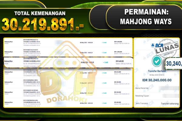 Bukti JP MAHJONG WAYS – ucapkan selamat kepada user id Asrxxx atas kemenangan di MAHJONG WAYS dengan total kemenangan Rp.30.219.891,- . Yang pasti nya langsung LUNAS sesuai bukti ya bosku. Dorahoki nih bosku berapapun akan tetap kami bayar lunas ya bosku. Kami mengucapkan Terima Kasih telah mempercayakan DORAHOKI sebagai Bandar Online pilihan dalam bermain judi online….