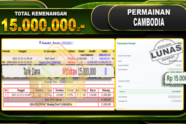 Bukti JP TOGEL CAMBODIA – ucapkan selamat kepada user id badxxx atas kemenangan di  TOGEL CAMBODIA dengan total kemenangan Rp.15.000.000,- Yang pasti nya langsung LUNAS sesuai bukti ya bosku. Dorahoki nih bosku berapapun akan tetap kami bayar lunas ya bosku
