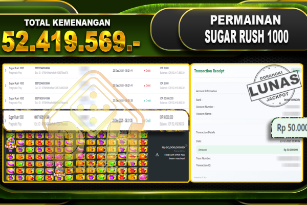 Bukti JP Sugar Rush 1000 – ucapkan selamat kepada user id chixx atas kemenangan di  Sugar Rush 1000 dengan total kemenangan Rp.52.419.569,- Yang pasti nya langsung LUNAS sesuai bukti ya bosku. Dorahoki nih bosku berapapun akan tetap kami bayar lunas ya bosku