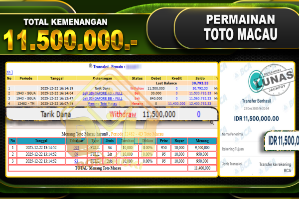 Bukti JP TOGEL TOTO MACAU 4D – ucapkan selamat kepada user id harxxxxx atas kemenangan di  TOGEL TOTO MACAU 4D dengan total kemenangan Rp.11.500.000,- Yang pasti nya langsung LUNAS sesuai bukti ya bosku. Dorahoki nih bosku berapapun akan tetap kami bayar lunas ya bosku
