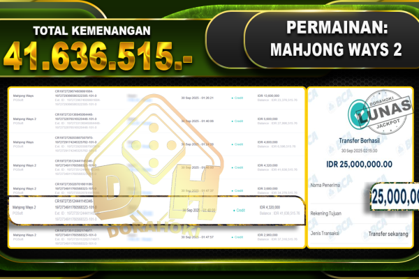 Bukti JP Mahjong Ways 2 – ucapkan selamat kepada user id bbyxxxx atas kemenangan di  Mahjong Ways 2 dengan total kemenangan Rp.41.636.515,- Yang pasti nya langsung LUNAS sesuai bukti ya bosku. Dorahoki nih bosku berapapun akan tetap kami bayar lunas ya bosku