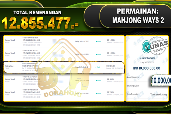 Bukti JP Mahjong Ways 2 – ucapkan selamat kepada user id kurxxxx atas kemenangan di  Mahjong Ways 2 dengan total kemenangan Rp.12.855.477,- Yang pasti nya langsung LUNAS sesuai bukti ya bosku. Dorahoki nih bosku berapapun akan tetap kami bayar lunas ya bosku