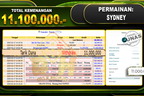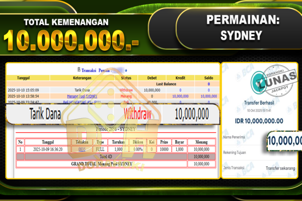 Bukti JP TOGEL SYDNEY – ucapkan selamat kepada user id benxxxxx atas kemenangan di TOGEL SYDNEY dengan total kemenangan Rp.10,000,000,- Yang pasti nya langsung LUNAS sesuai bukti ya bosku. Dorahoki nih bosku berapapun akan tetap kami bayar lunas ya bosku