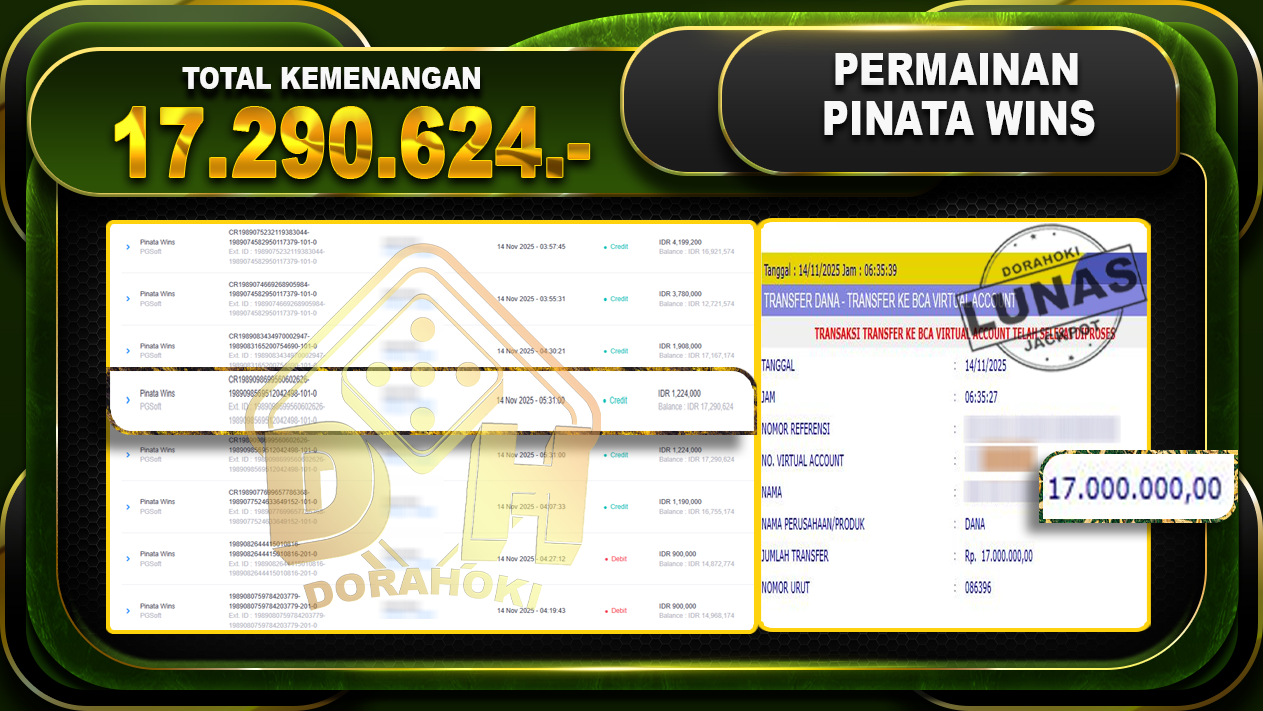 Bukti JP Pinata Wins – ucapkan selamat kepada user id makxxxxx atas kemenangan di Pinata Wins dengan total kemenangan Rp.17.290.624,- Yang pasti nya langsung LUNAS sesuai bukti ya bosku. Dorahoki nih bosku berapapun akan tetap kami bayar lunas ya bosku