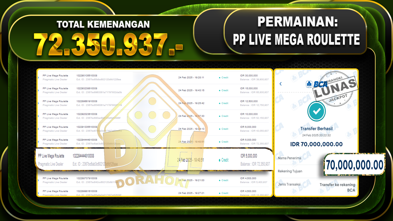 Bukti JP PP LIVE MEGA ROULETTE – ucapkan selamat kepada user id kaliaxxx atas kemenangan di PP LIVE MEGA ROULETTE dengan total kemenangan Rp.72.350.937,- . Yang pasti nya langsung LUNAS sesuai bukti ya bosku. Dorahoki nih bosku berapapun akan tetap kami bayar lunas ya bosku.