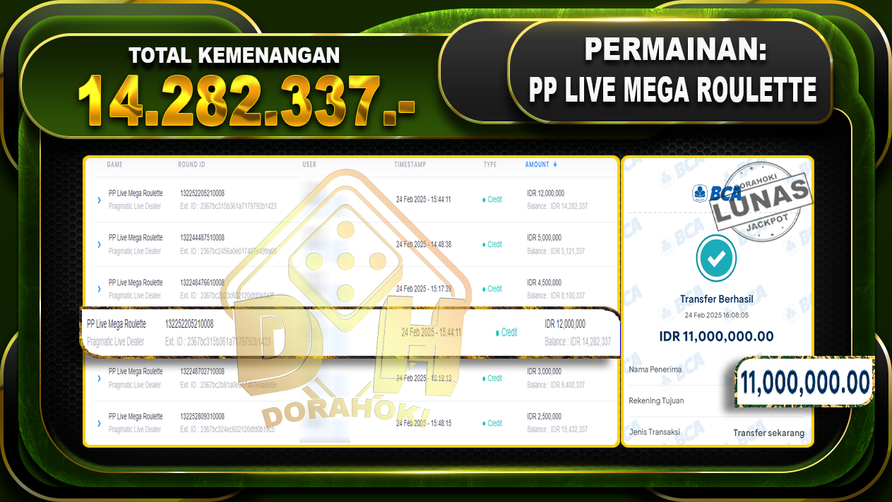 Bukti JP PP LIVE MEGA ROULETTE – ucapkan selamat kepada user id kaliaxxx atas kemenangan di PP LIVE MEGA ROULETTE dengan total kemenangan Rp.14.282.337,- . Yang pasti nya langsung LUNAS sesuai bukti ya bosku. Dorahoki nih bosku berapapun akan tetap kami bayar lunas ya bosku.