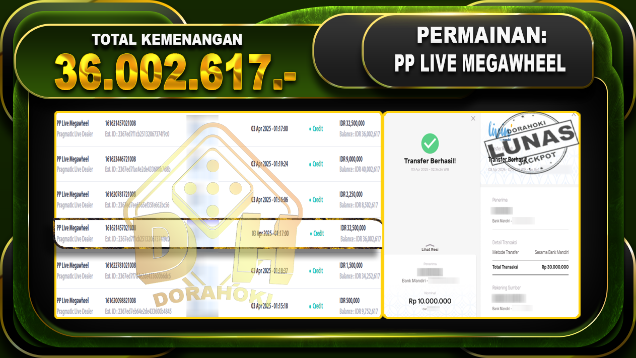 Bukti JP PP LIVE MEGAWHEEL – ucapkan selamat kepada user id Jojxxx atas kemenangan di PP LIVE MEGAWHEEL dengan total kemenangan Rp.36.002.617,- . Yang pasti nya langsung LUNAS sesuai bukti ya bosku. Dorahoki nih bosku berapapun akan tetap kami bayar lunas ya bosku.