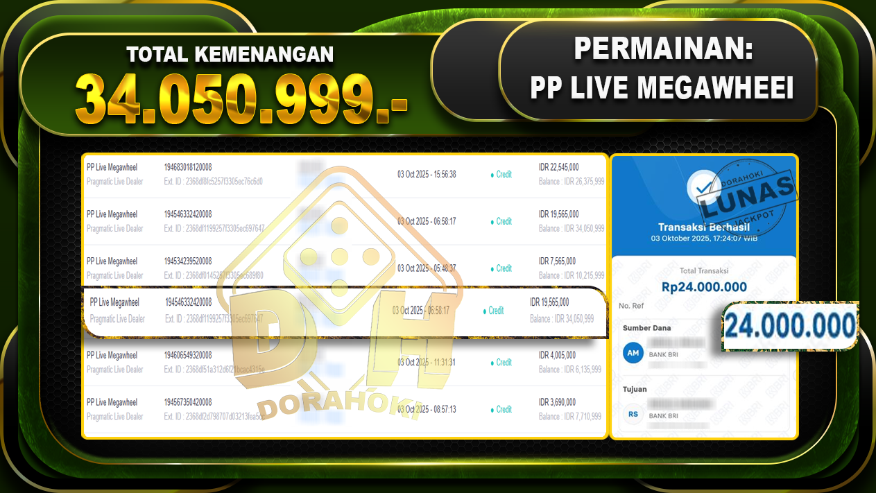 Bukti JP PP Live Megawheel- Yang kami berikan ini sah dan real tanpa di rekayasa bosku dan hanya bertujuan untuk meningkatkan kepercayaan member kami dan memberikan kenyamanan saat bermain jadi bosku tidak perlu khawatir MENANG BERAPAPUN PASTI KAMI BAYAR LUNAS!!