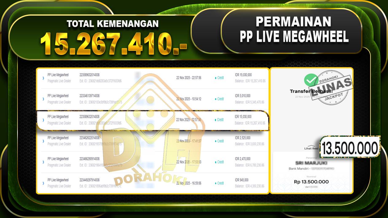 Bukti JP PP Live Megawheel – ucapkan selamat kepada user id jukxxxx atas kemenangan di  PP Live Megawheel dengan total kemenangan Rp.15.267.410,- Yang pasti nya langsung LUNAS sesuai bukti ya bosku. Dorahoki nih bosku berapapun akan tetap kami bayar lunas ya bosku