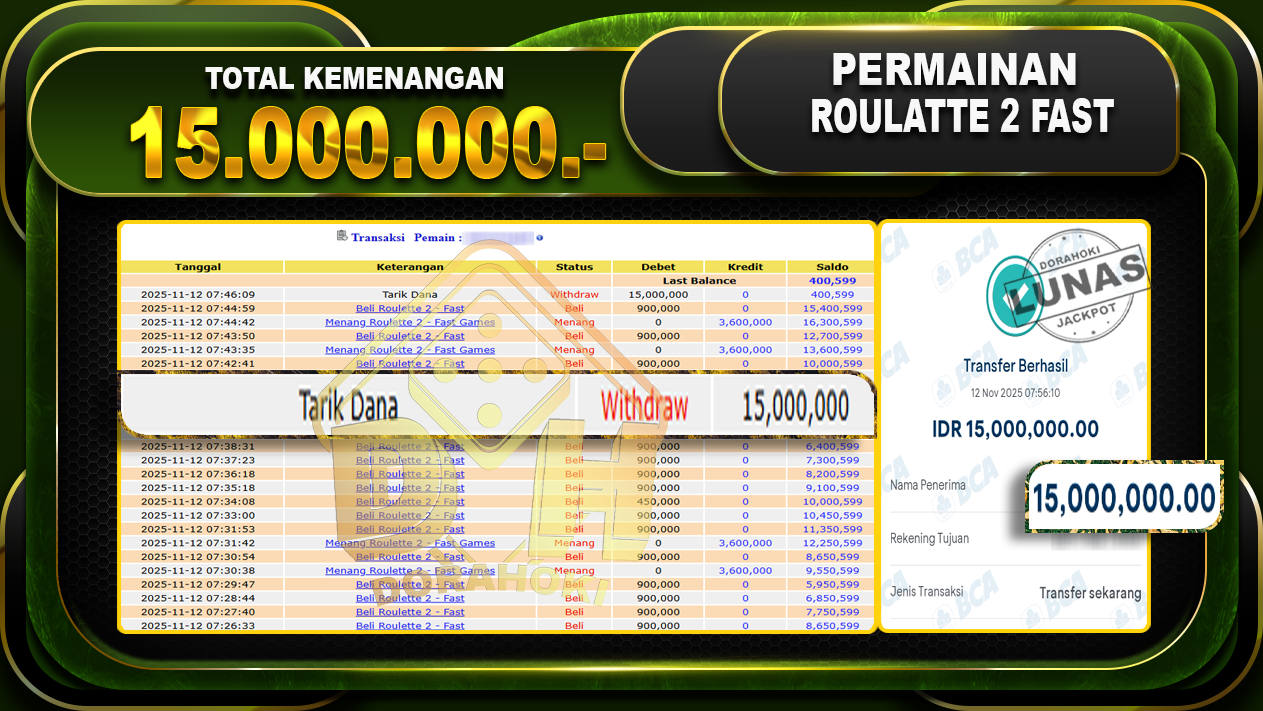 Bukti JP Roulette 2 – Fast- ucapkan selamat kepada user id nikxxxxx atas kemenangan di Roulette 2 – Fast dengan total kemenangan Rp.15.000.000,- . Yang pasti nya langsung LUNAS sesuai bukti ya bosku. Dorahoki nih bosku berapapun akan tetap kami bayar lunas ya bosku.