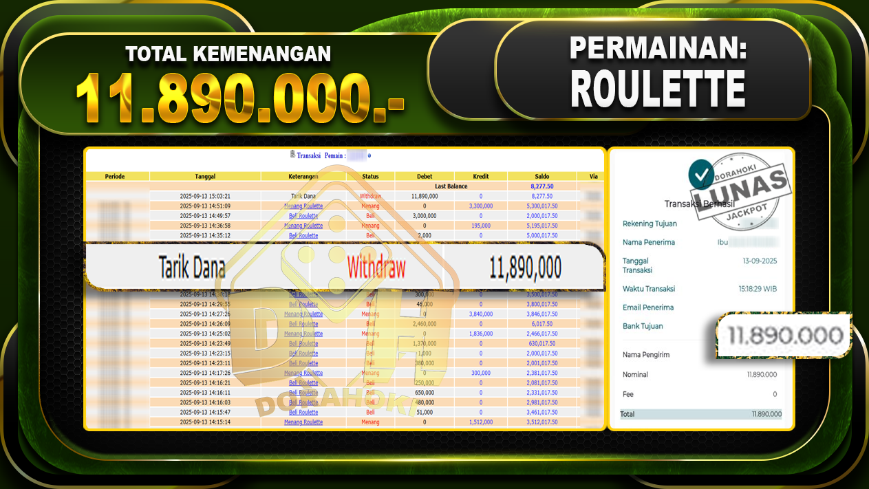 Bukti JP Roulette – ucapkan selamat kepada user id Sosxxx atas kemenangan di Roulette dengan total kemenangan Rp.11.890.000,- Yang pasti nya langsung LUNAS sesuai bukti ya bosku. Dorahoki nih bosku berapapun akan tetap kami bayar lunas ya bosku.