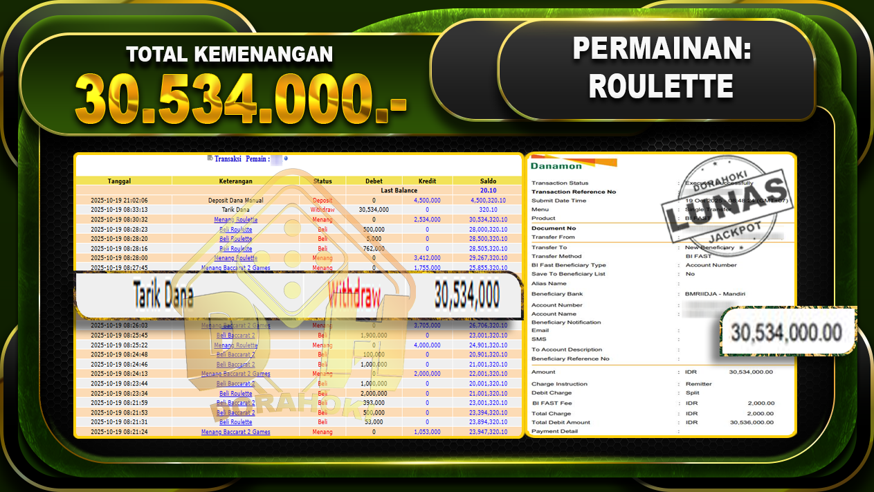 Bukti JP Roulette – ucapkan selamat kepada user id jixxx atas kemenangan di Roulette dengan total kemenangan Rp.30.534.000,- Yang pasti nya langsung LUNAS sesuai bukti ya bosku. Dorahoki nih bosku berapapun akan tetap kami bayar lunas ya bosku.