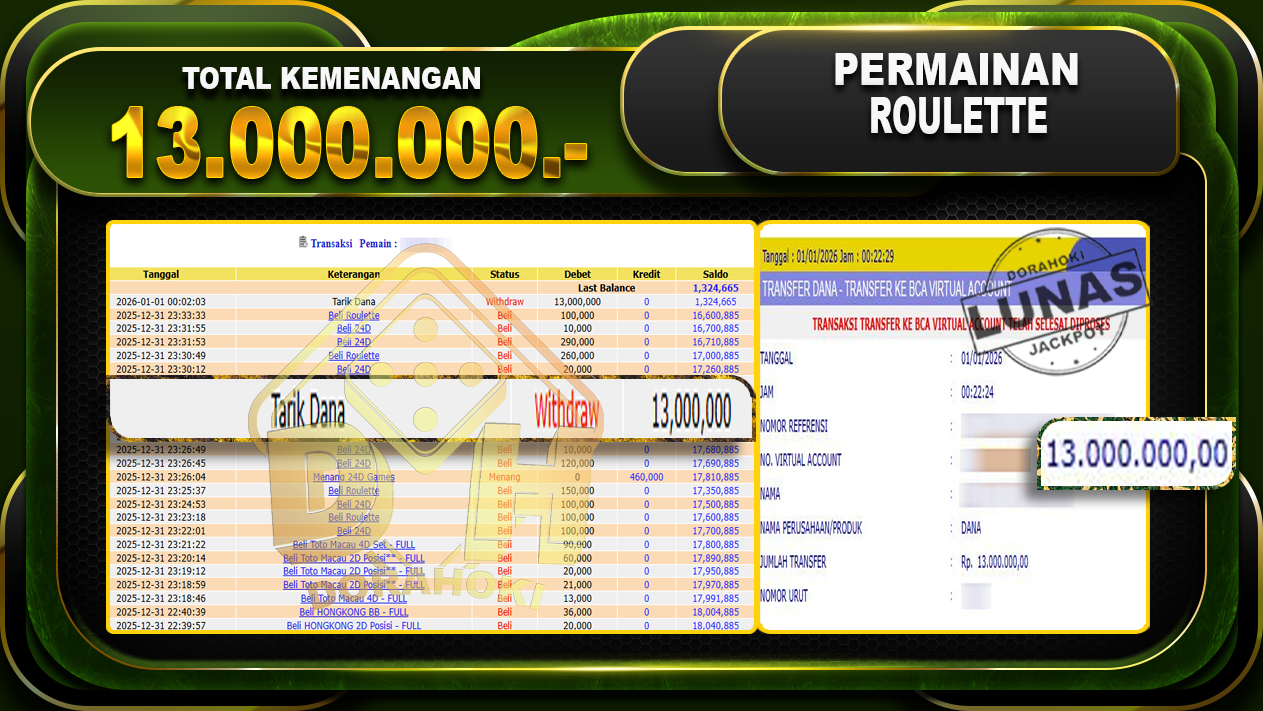 Bukti JP ROULETTE GAMES – ucapkan selamat kepada user id wedxxxx atas kemenangan di ROULETTE GAMES dengan total kemenangan Rp.13.000.00,- . Yang pasti nya langsung LUNAS sesuai bukti ya bosku. Dorahoki nih bosku berapapun akan tetap kami bayar lunas ya bosku.