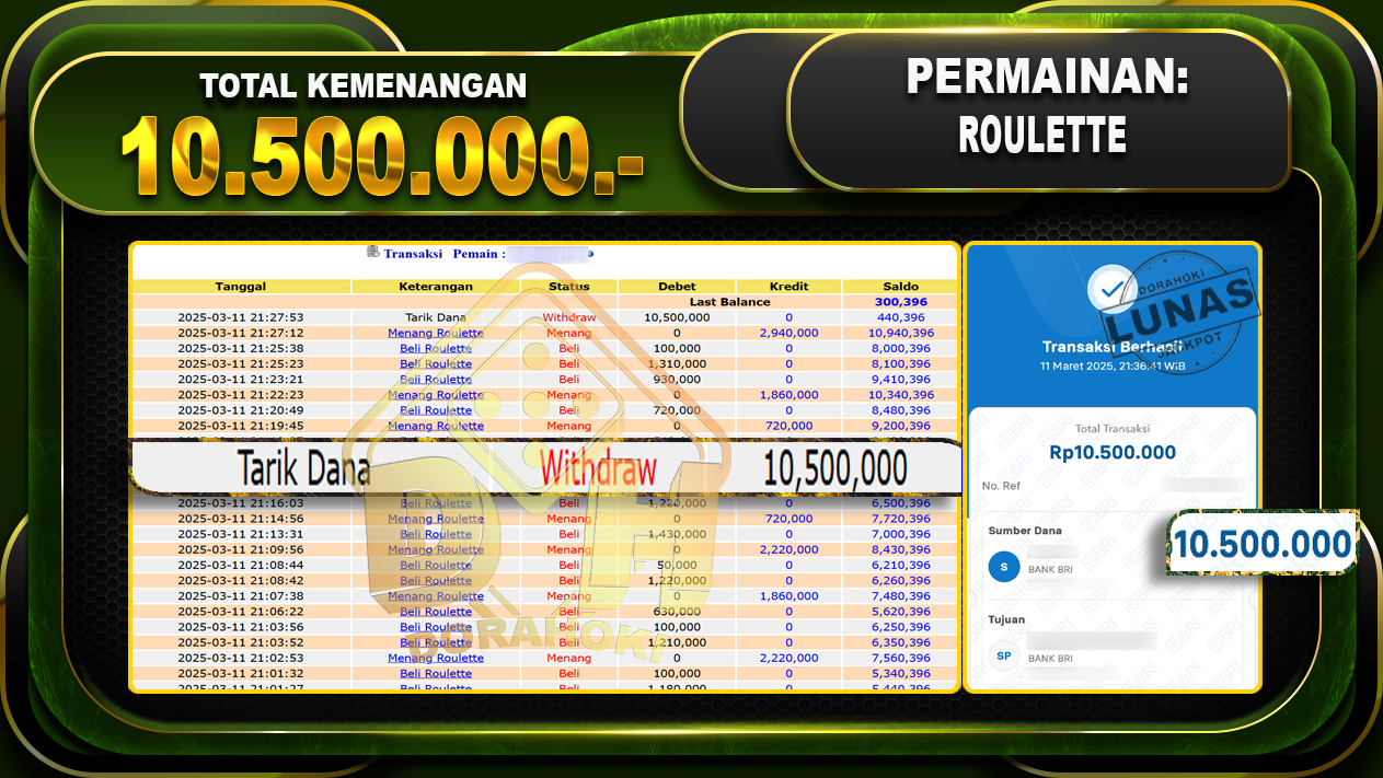 Bukti JP ROULETTE GAMES – ucapkan selamat kepada user id Berxxx atas kemenangan di  ROULETTE GAMES  dengan total kemenangan Rp.10.500.000,- . Yang pasti nya langsung LUNAS sesuai bukti ya bosku. Dorahoki nih bosku berapapun akan tetap kami bayar lunas ya bosku.