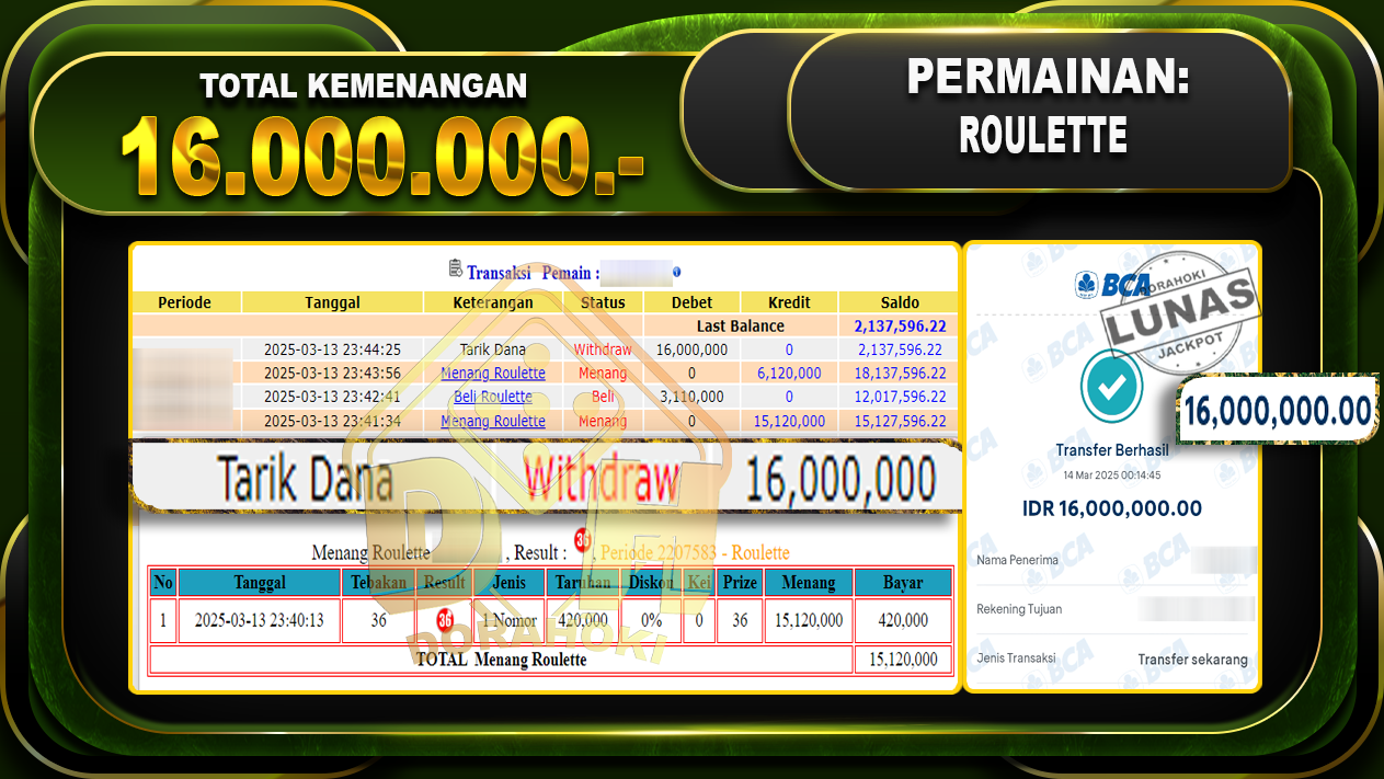 Bukti JP ROULETTE GAMES – ucapkan selamat kepada user id Arwxxx atas kemenangan di ROULETTE GAMES dengan total kemenangan Rp.16.000.000,- . Yang pasti nya langsung LUNAS sesuai bukti ya bosku. Dorahoki nih bosku berapapun akan tetap kami bayar lunas ya bosku.