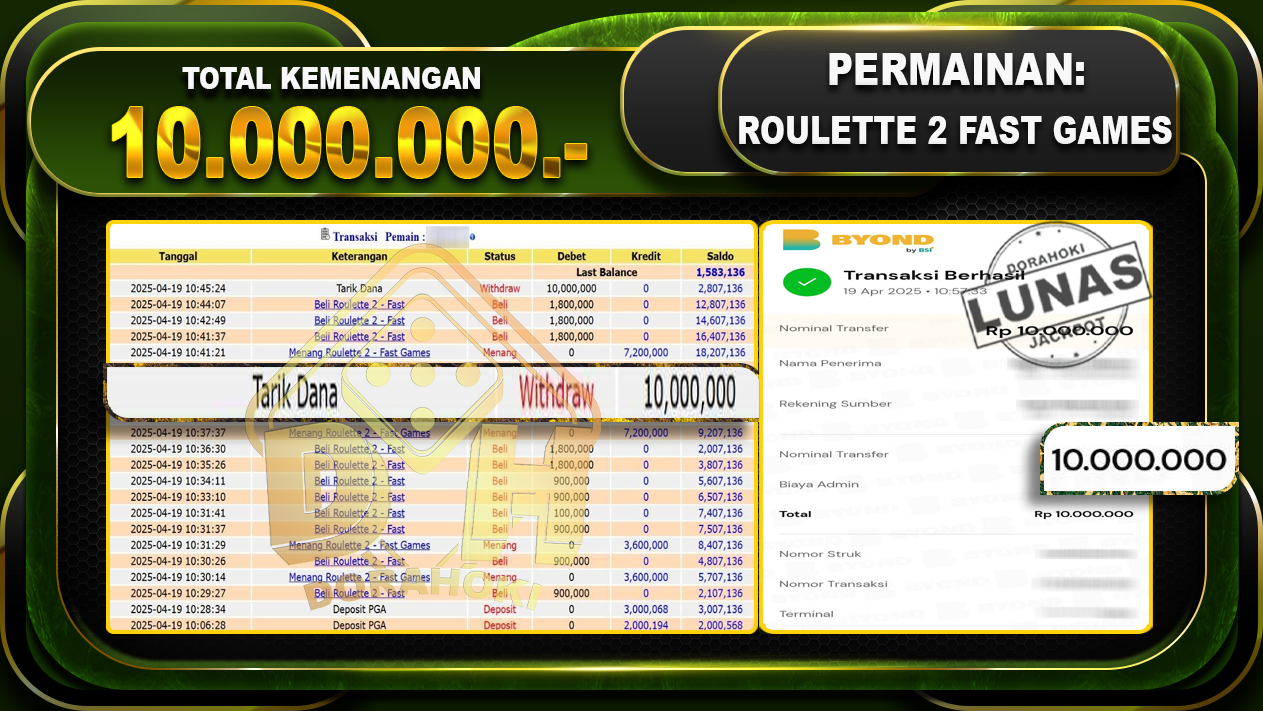 Bukti JP ROULETTE GAMES – ucapkan selamat kepada user id Gghxxx atas kemenangan di ROULETTE GAMES dengan total kemenangan Rp.10.000.000,- . Yang pasti nya langsung LUNAS sesuai bukti ya bosku. Dorahoki nih bosku berapapun akan tetap kami bayar lunas ya bosku.