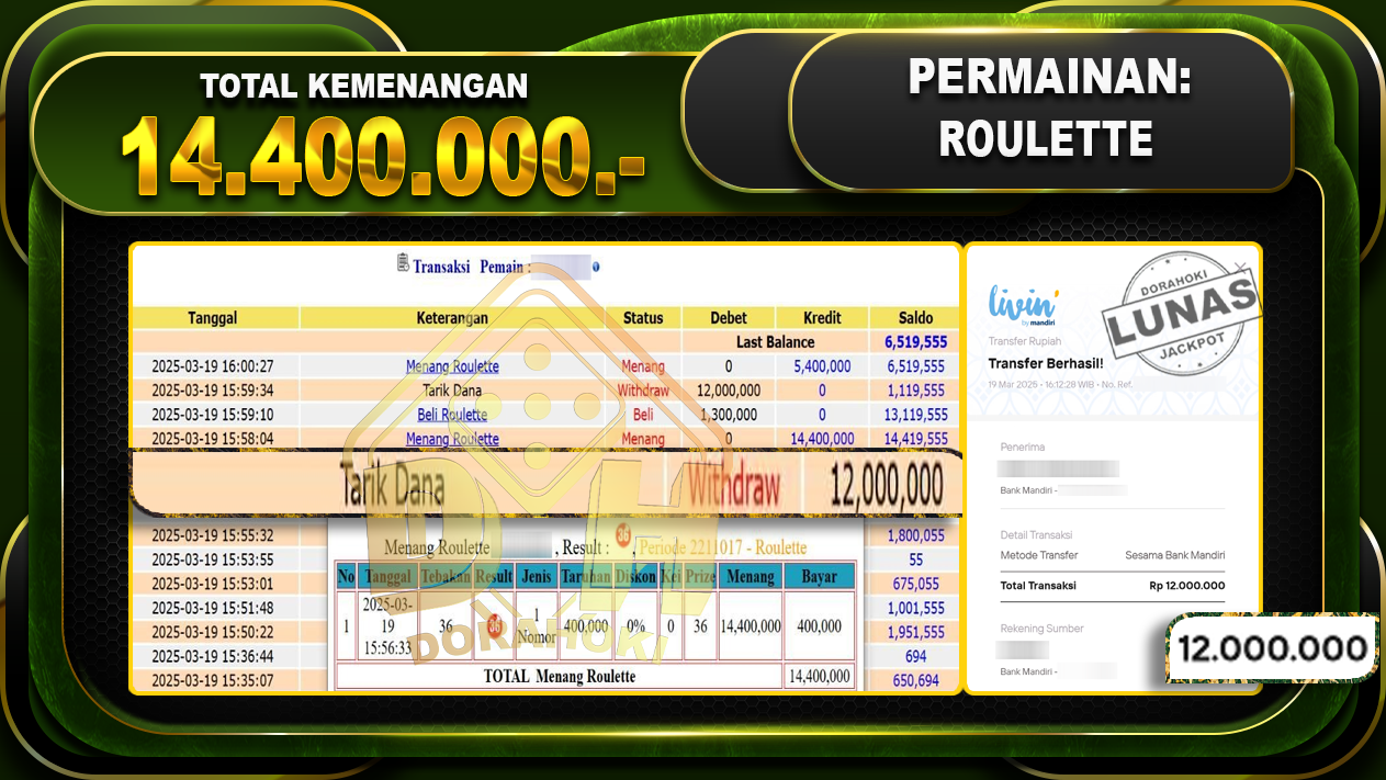 Bukti JP ROULETTE GAMES – ucapkan selamat kepada user id Omaxxx atas kemenangan di ROULETTE GAMES dengan total kemenangan Rp.14.400.000,- . Yang pasti nya langsung LUNAS sesuai bukti ya bosku. Dorahoki nih bosku berapapun akan tetap kami bayar lunas ya bosku.