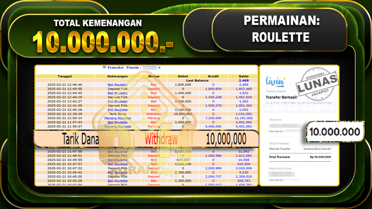 Bukti JP ROULETTE GAMES – Yang kami berikan ini sah dan real tanpa di rekayasa bosku dan hanya bertujuan untuk meningkatkan kepercayaan member kami dan memberikan kenyamanan saat bermain jadi bosku tidak perlu khawatir MENANG BERAPAPUN PASTI KAMI BAYAR LUNAS!!