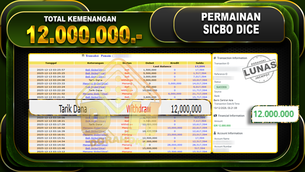 Bukti JP Sicbo Dice – ucapkan selamat kepada user id manxxxx atas kemenangan di  Sicbo Dice  dengan total kemenangan Rp.12,000,000,- Yang pasti nya langsung LUNAS sesuai bukti ya bosku. Dorahoki nih bosku berapapun akan tetap kami bayar lunas ya bosku.
