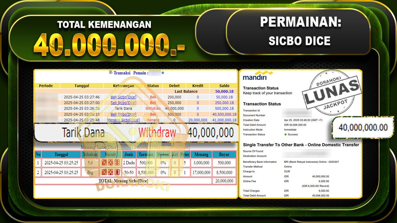 Bukti JP SICBO DICE – ucapkan selamat kepada user id Dinxxx atas kemenangan di  SICBO DICE  dengan total kemenangan Rp.40.000.000,- . Yang pasti nya langsung LUNAS sesuai bukti ya bosku. Dorahoki nih bosku berapapun akan tetap kami bayar lunas ya bosku.