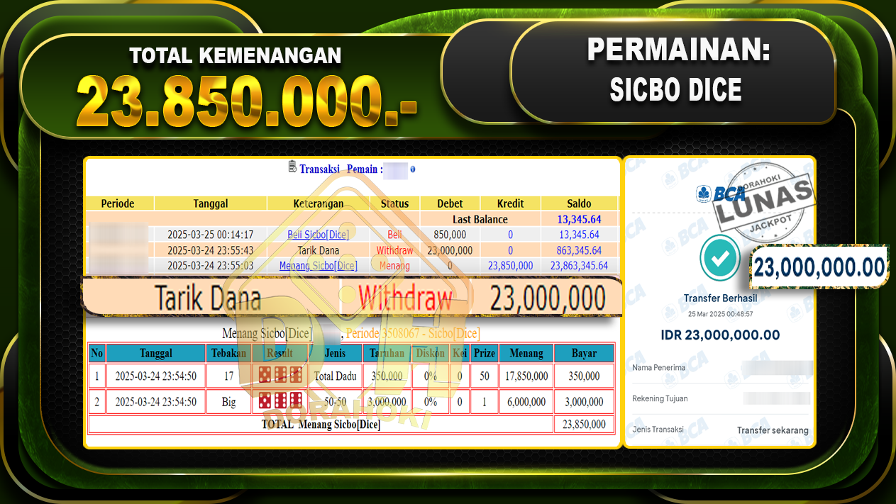 Bukti JP SICBO DICE – ucapkan selamat kepada user id Gapxxx atas kemenangan di  SICBO DICE  dengan total kemenangan Rp.23.850.000,- . Yang pasti nya langsung LUNAS sesuai bukti ya bosku. Dorahoki nih bosku berapapun akan tetap kami bayar lunas ya bosku.