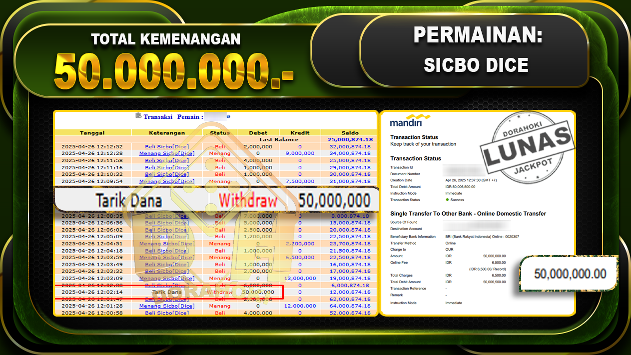 Bukti JP SICBO DICE – ucapkan selamat kepada user id Dinxxx atas kemenangan di  SICBO DICE  dengan total kemenangan Rp.50.000.000,- . Yang pasti nya langsung LUNAS sesuai bukti ya bosku. Dorahoki nih bosku berapapun akan tetap kami bayar lunas ya bosku.