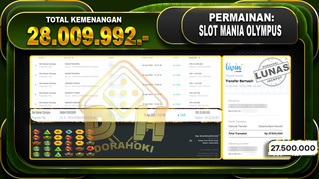 Bukti JP SLOT MANIA OLYMPUS – ucapkan selamat kepada user id Jeyxxx atas kemenangan di SLOT MANIA OLYMPUS dengan total kemenangan Rp.28.009.992,- . Yang pasti nya langsung LUNAS sesuai bukti ya bosku. Dorahoki nih bosku berapapun akan tetap kami bayar lunas ya bosku.