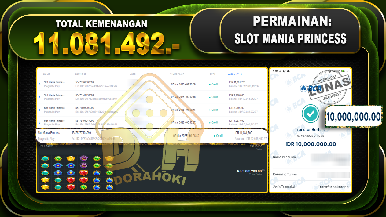Bukti JP SLOT MANIA PRINCESS – ucapkan selamat kepada user id Boyxxx atas kemenangan di SLOT MANIA PRINCESS dengan total kemenangan Rp.11.081.492,- . Yang pasti nya langsung LUNAS sesuai bukti ya bosku. Dorahoki nih bosku berapapun akan tetap kami bayar lunas ya bosku.